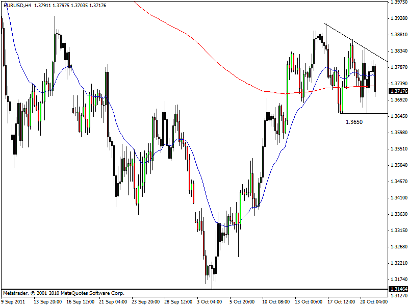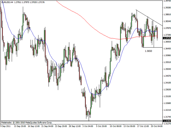 Ieri giornata molto negativa per le borse europee, in particolare per la piazza milanese che ha chiuso con una flessione vicina al 4% e con lo spread Btp-Bund che stamattina è salito anche sopra i 400 punti base. A Wall Street, invece, il Dow Jones è riuscito alla fine a recuperare le perdite iniziali e a chiudere in positivo dello 0,3%. Intanto, alle ore 10 è stato pubblicato l’indice tedesco IFO che ha evidenziato una flessione a 106.4 dai 107.5 precedenti, ma leggermente meglio delle stime degli analisti che si aspettavano un dato a 106.3. Oggi inizia anche il summit UE che terminerà nel week-end e a tal proposito il duo Merkel-Sarkozy, in una nota congiunta, ha dichiarato che entro mercoledì ci sarà un piano per l’Europa che sarà poi sottoposto anche al G20 di Cannes del prossimo 3 e 4 novembre. Le borse europee proseguono in leggero rialzo, anche se sembra essere dinanzi a movimenti tecnici dovuti a prese di beneficio dopo le pesanti perdite di ieri. Infatti, gli indici azionari stanno velocemente perdendo quota,anche se si prova a tenere a tutti i costi i supporti di brevissimo periodo per evitare la completa inversione del trend. Sul Forex l’euro è in ribasso da questa mattina con il cross EUR/USD che per ora mantiene il supporto psicologico di 1.37, anche se -come si evince dal grafico a 4 ore – sembra orientato verso il supporto di area 1.3650. Quasi certamente un nuovo test di questi livelli potrebbe provocare una maggiore pressione dei venditori e sancire il ripristino definitivo del bearish trend di medio periodo. In caso di perdita di 1.3650 bisogna aspettarsi almeno un ritorno in area 1.3550, anche se bisognerà vedere cosa si deciderà nel week-end per la crisi europea. In difficoltà anche EUR/JPY che è in fase laterale sul chart a 240 minuti tra 106.50 e 104.80. Il triangolo di compressione in corso potrebbe esplodere al ribasso in caso di perdita dei supporti di breve periodo con successivo target a 104. Sul Forex occhio anche alla sterlina che sembra in fase distributiva contro dollaro sotto i top di periodo posti poco sotto 1.5850. Nel brevissimo periodo la perdita decisa di area 1.5750 dovrebbe provocare l’inizio di un bearish trend con target a 1.5680.