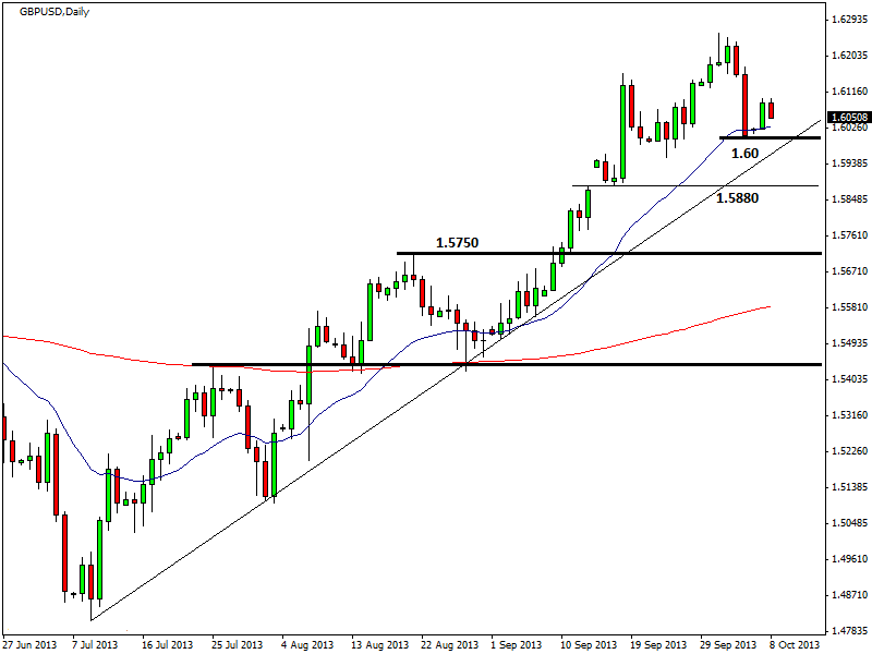 Per il cable potrebbe esserci un’inversione del trend nel caso in cui i prezzi dovessero scendere con decisione sotto il supporto chiave di 1,60, che è anche una soglia psicologica molto importante per il sentiment di breve termine. In questo caso il cable dovrebbe scendere subito a 1,5950 e puntare poi al successivo supporto di 1,5880. Attenzione, però, in caso di breakout esplosivo di 1,61, ipotesi da considerare visto che il biglietto verde è ancora sotto pressione per i noti problemi legati allo shutdown e al debito. Se la sterlina dovesse superare 1,61 dollari, allora ci sarebbero buone possibilità per il cambio di rivedere area 1,62 prima e 1,6260 poi, ovvero i top di periodo.