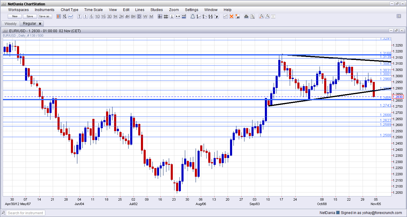 - 1.2880: supporto per un po’ di tempo durante il mese di ottobre, ma ora la linea si accinge a diventare una nuova resistenza. 1.28 è il confine del range di prezzi e bisogna notare come al momento la coppia sia scambiata a ridosso di questa pericolosa area.