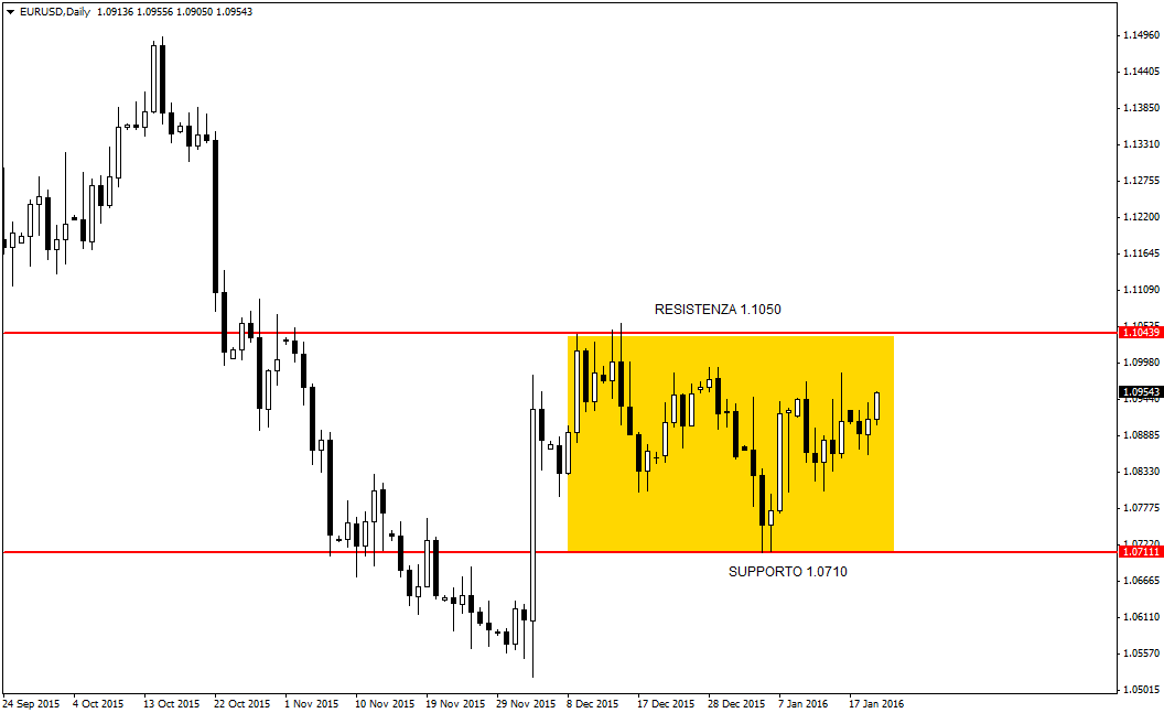 Tuttavia sul forex il cambio EUR/USD sembra essere al momento immune a questo contesto di alta volatilità, tanto da continuare a mostrare un andamento lateral-ribassista compreso tra 1,1050 e 1,0710 senza evidenziare particolari strappi al rialzo o al ribasso. Il mercato è probabilmente in attesa di conoscere le prossime mosse delle due banche centrali più importanti al mondo, ovvero la FED e la BCE. L’istituto di Washington dovrebbe proseguire la stretta sui tassi di interesse, cominciata a metà dicembre con il primo rialzo dopo 10 anni, ma senza dare alcuna accelerazione all’attuale politica monetaria restrittiva nonostante il significativo miglioramento dell’economia a stelle e strisce.