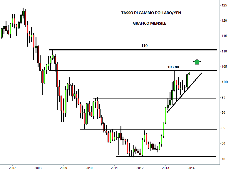 L’eventuale breakout esplosivo della resistenza di 103,80 dovrebbe favorire ancora il rally del cambio, che su base mensile sembra essere proiettato verso il target di 110. In rialzo troviamo anche il cross euro/yen, che ha sfiorato quota 140, e il cross sterlina/yen che ha superato quota 169. Entrambi i cross valutari sono ai massimi da oltre 5 anni. Nel breve periodo gli analisti tecnici si aspettano un pullback fisiologico prima della ripartenza verso nuovi ambiziosi target di prezzo.