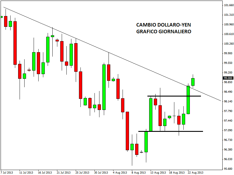 Secondo Minori Uchida, chief Analyst di Bank of Tokyo-Mitsubishi UFJ, "considerando che il calo del dollaro sotto 97 yen è stato abbastanza significativo, il dollaro ora sembra incline a testare un movimento al rialzo nel corso della prossima settimana, forse sopra 100 yen, a meno che l’azionario non perda terreno". Secondo lo specialista, lo yen sarà influenzato significativamente venerdì prossimo in occasione della pubblicazione del dato sull’inflazione in Giappone nel mese di luglio.