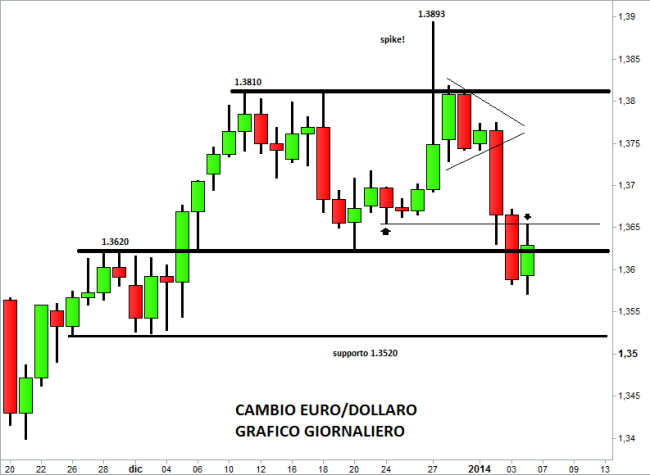 Da un punto di vista tecnico l’andamento del cambio euro/dollaro nel breve periodo dipende dalla capacità o meno dei prezzi di superare la resistenza di area 1,3650. In caso di breakout esplosivo, i prezzi dovrebbero salire fino a 1,37 – 1,3720, dove è posta un’altra resistenza rilevante. In caso di test fallito, i venditori avrebbero quasi certamente gioco facile nel riportare le quotazioni sotto 1,36 con la possibilità di assistere a un calo molto robusto fino in area 1,3520.