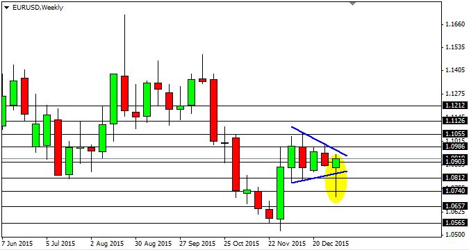 Sul grafico con timeframe settimanale, la prima candela del 2015 mostra un hammer con un’ombra molto pronunciata. Le contrattazioni hanno quindi fallito il tentativo di rompere al ribasso la conformazione che comprime il prezzo verso l’area 1.09 e hanno poi dato forma ad un pattern rialzista. Il tetto di 1.0986 sarà un passo fondamentale per la risalita di EUR/USD: superata questa resistenza, la quotazione potrebbe muovere verso i target di 1.1055, 1.1126 e 1.1212. Un ripiegamento al di sotto di 1.0812, viceversa, potrebbe dare origine a una fase ribassista che porterebbe al test i supporti di 1.0740 e 1.0657.