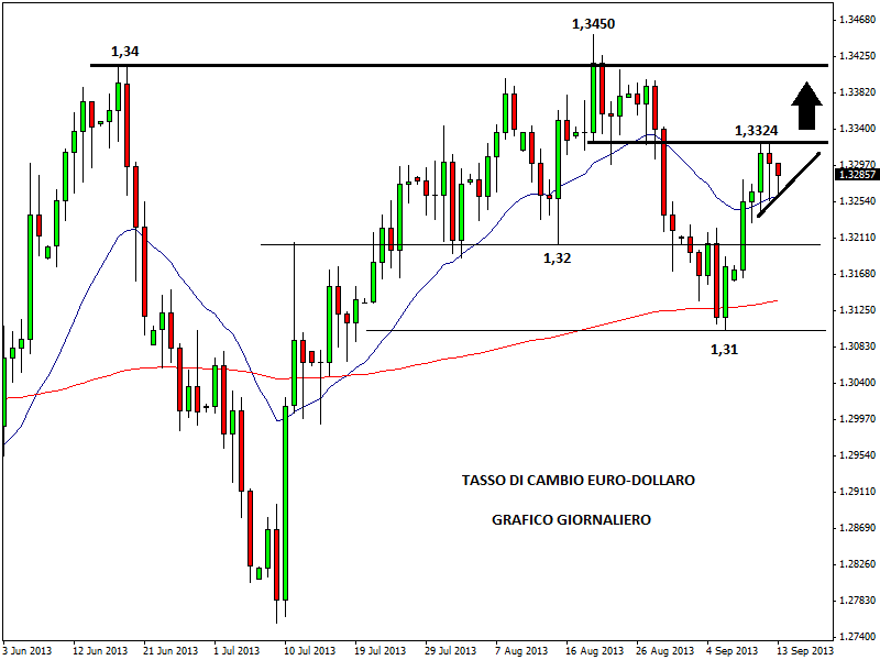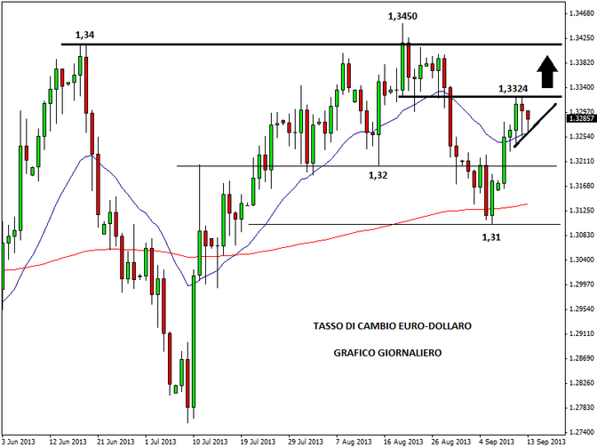 Il tasso di cambio euro-dollaro resta tonico sui mercati valutari, sebbene negli ultimi due giorni ha preso il via una fase di ritracciamento fisiologico delle quotazioni che comunque hanno trovato finora supporto a 1,3255. I prezzi sono stati respinti per due giorni consecutivi a 1,3324 e ora è in corso una fase di consolidamento con bassa volatilità. A questo punto appare probabile un breakout esplosivo dei prezzi, in caso di superamento della resistenza di 1,3324 oppure se il supporto di 1,3255 dovesse essere perforato con decisione. In caso di rottura rialzista, il cambio euro-dollaro dovrebbe spingersi fino alla resistenza di 1,34.