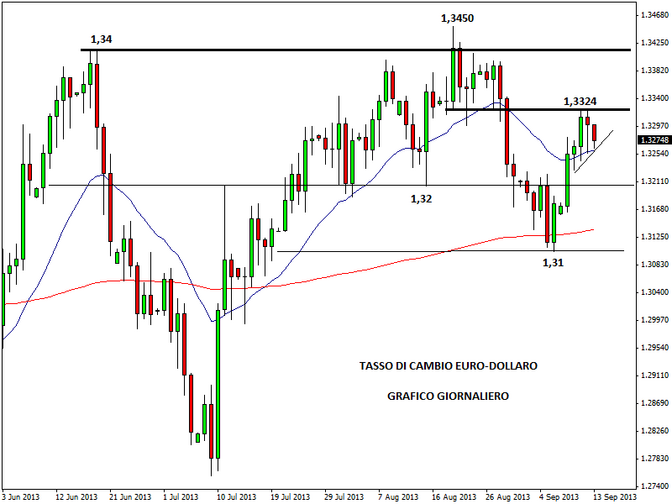 Tuttavia, se la FED dovesse annunciare ufficialmente l’avvio del tapering già dalla prossima settimana, il cambio euro-dollaro potrebbe iniziare nuovamente a scendere fino a tornare al test del supporto di 1,31. Nel breve periodo il cambio potrebbe, però, salire ancora: in caso di breakout di 1,3324, è possibile un nuovo allungo verso 1,3370 prima e 1,34 poi. Un segnale di negatività arriverebbe soltanto in caso di chiusura giornaliera inferiore a 1,3250 o di 1,32.