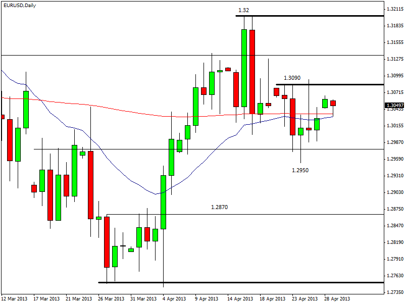 Da un punto di vista tecnico, il cambio euro/dollaro prosegue nella sua fase laterale tra 1,3090 e 1,2950. Giovedì 2 maggio, però, il mercato dovrebbe prendere una direzione ben precisa e tra l’altro è atteso un movimento molto direzionale dopo la decisione della Bce sui tassi. In caso di breakout esplosivo della resistenza di 1,3090 è probabile un’ascesa fino a 1,3130 prima e forse anche 1,32 poi. Se invece i prezzi dovessero scendere sotto il supporto di 1,2950, il cambio dovrebbe raggiungere velocemente 1,2880 prima e 1,2750 poi.
