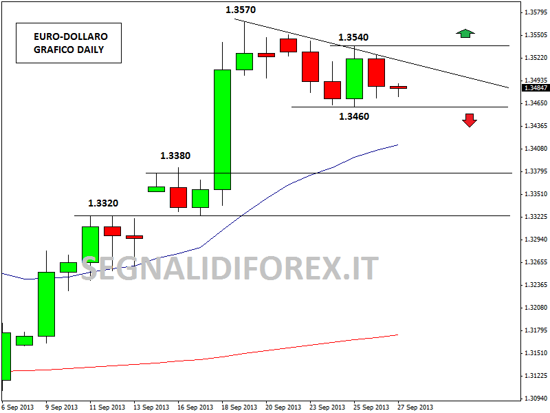 Il dato macro americano di ieri pomeriggio relativo alle nuove richieste settimanali di sussidi per la disoccupazione negli Stati Uniti ha evidenziato un miglioramento che va oltre le aspettative. Le richieste sono state 305mila, mentre gli analisti si aspettavano un dato peggiore a 325mila. Ogni volta che un indicatore dello stato di salute del mercato del lavoro USA tende a migliorare, le aspettative di avvio del tapering aumentano e sul forex il dollaro americano riesce a guadagnare terreno nei confronti dellemajor currencies. E’ successo anche ieri pomeriggio, con il greenback sugli scudi soprattutto contro euro e yen. Il tasso di cambio euro-dollaro è sceso fin sotto 1,35.