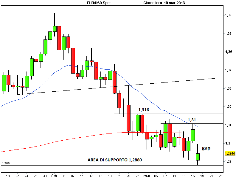Il forex è un mercato che spesso evidenzia reazioni emotive molto violente degli investitori, che si traducono in un brusco incremento della volatilità e dei prezzi. Il salvatagggio choc di Cipro, messo a punto tramite il prelievo forzoso dai conti correnti delle banche cipriote, ha creato panico e generato forti vendite soprattutto sull’euro. Domenica notte la moneta unica ha aperto con ampi gap down, addirittura superiori all’1% sul dollaro e al 2% sullo yen.