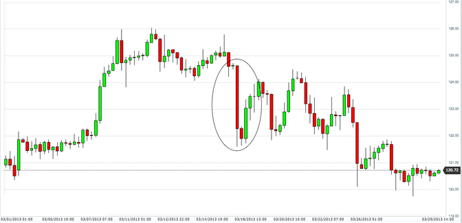– Tuttavia, come evidenziato dalle lunghe candele ribassiste, le news del bailout di Cipro hanno spinto al ribasso il cambio che dal massimo di 1.3134 (post BCE) è arrivato a sfondare i supporti più duri fino a raggiungere un minimo di 1.2752 dopo le dichiarazioni del presidente dell’Eurogruppo, Dijsselbloem, il quale ha parlato della possibilità che lo schema del bailout di Cipro possa diventare il modello per i prossimi salvataggi dell’Eurozona.