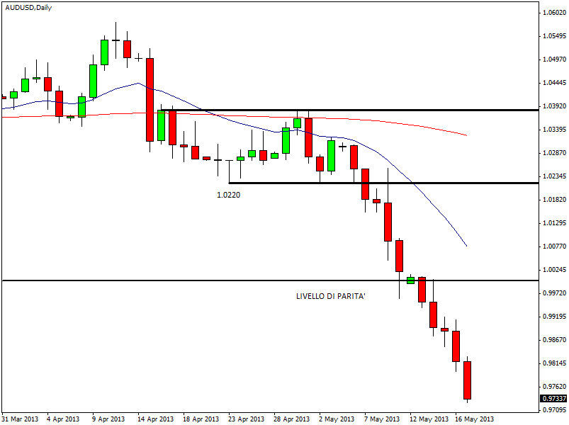 Il crollo del dollaro australiano sembra non avere fine. Sorprendendo anche la maggior parte degli analisti valutari, l’Aussie ha imboccato la strada del ribasso spingendosi addirittura fin sotto 0,9730 ai minimi da giugno 2012. Da inizio mese il cross Aud/Usd perde il 6,5%, appesantito dal taglio dei tassi di interesse della RBA che ha portato il costo del denaro ai minimi di sempre al 2,75%. A mettere in ginocchio l’Aussie è anche la debolezza delle commodity, le aspettative di crescita inferiore alle attese e l’andamento negativo dei conti pubblici.