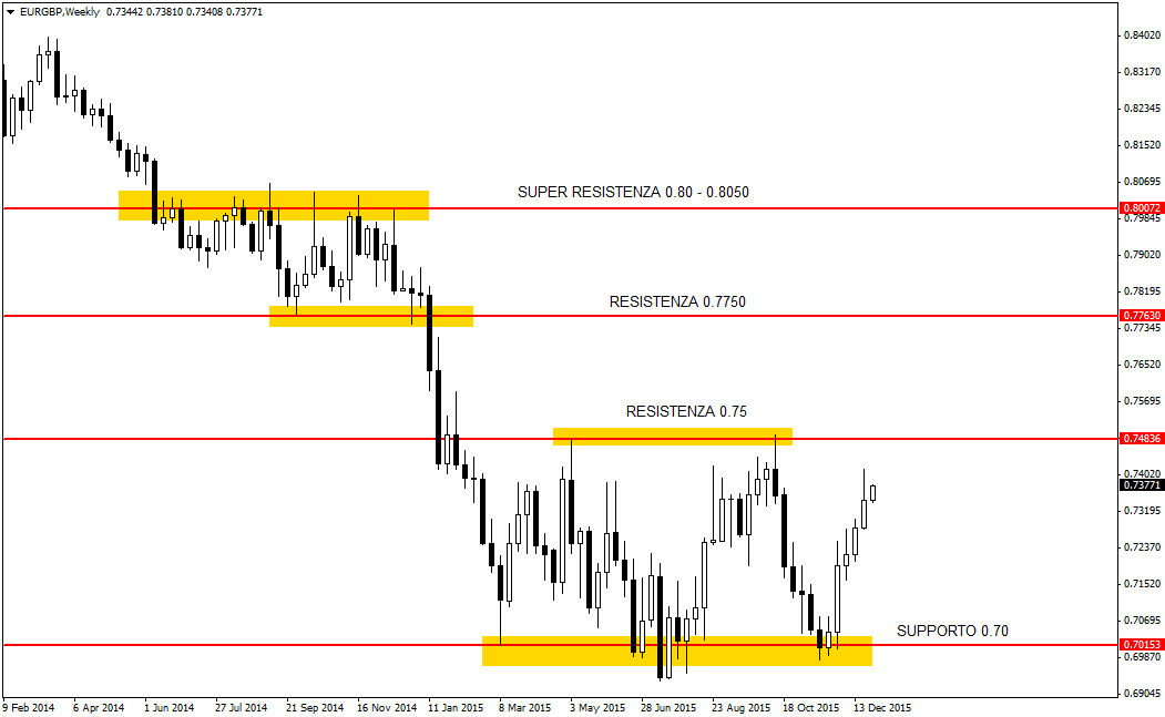 Da un punto di vista tecnico il cross Euro/Sterlina ha formato un “Doppio Minimo” su base weekly, che rappresenta un pattern di inversione del trend particolarmente significativo in un’ottica di medio periodo. Tra l’altro questo pattern - noto in analisi tecnica anche come “W Bottom”, ma che nella fattispecie potrebbe essere considerato addirittura un “Triplo Minimo” – avrebbe la possibilità di consacrarsi nelle prossime settimane in caso di breakout esplosivo dell’area chiave di resistenza posta tra 0,7480 e 0,75.