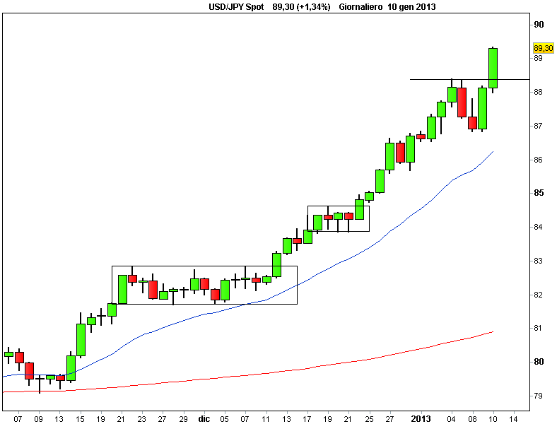 A far crollare ulteriormente lo yen sono state le ultime dichiarazioni del ne-premier, che ha spinto la BoJ a fissare come uno dei suoi obiettivi principali la massimizzazione dell’occupazione. In attesa della riunione del 20-21 gennaio, lo yen continua a perdere colpi, tanto che il tasso di cambio dollaro/yen è salito sui massimi da luglio 2010 a 89,35. Il prossimo obiettivo è area 90.