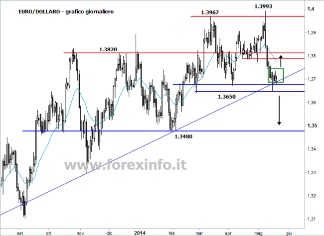 Al momento il programma di quantitative easing è sceso a 45 miliardi di dollari al mese, a seguito del tapering della FED confermato già per 4 mesi consecutivi a un ritmo costante di 10 miliardi di dollari. In ogni caso Dudley ha sottolineato che le tempistiche relative alla crescita dei tassi negli Usa dipenderanno chiaramente dall’andamento dell’economia americana, attesa comunque in deciso miglioramento nella seconda parte del 2014. Stasera potrebbe arrivare qualche indicazione in più con le minute della FED, ovvero i verbali dell’ultimo meeting di aprile.
