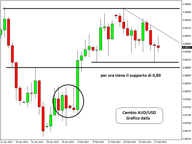Nel quarto trimestre le spese di capitale (CAPEX) sono scese del 5,2%, dopo il buon dato registrato nel trimestre precedente (+3,6%). Gli analisti finanziari si aspettavano una flessione, ma solo dell’1,6%. Pesa poi anche il calo dei prezzi del minerale di ferro, una delle materie prima più importanti per l’economia australiana. Sul forex il tasso di cambio AUD/USD è sceso ieri sui minimi delle ultime tre settimane sul supporto di 0,89, ma è poi riuscito a rimbalzare fino a 0,8990 per poi stabilizzarsi in area 0,8950. Pesante, invece, la flessione contro il dollaro neozelandese: il cross AUD/NZD anche stanotte risulta in calo sui minimi da quasi un mese in area 1,0650.