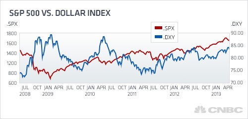 "Guardando i grafici di entrambi, chiaramente su una base a lungo termine, possiamo vedere che il dollaro è debole rispetto allo [Standard & Poor 500]", ha detto Tracy Knudsen, analista di mercato di Lowry Research. "Noi pensiamo che gli stock siano in una posizione di forza."