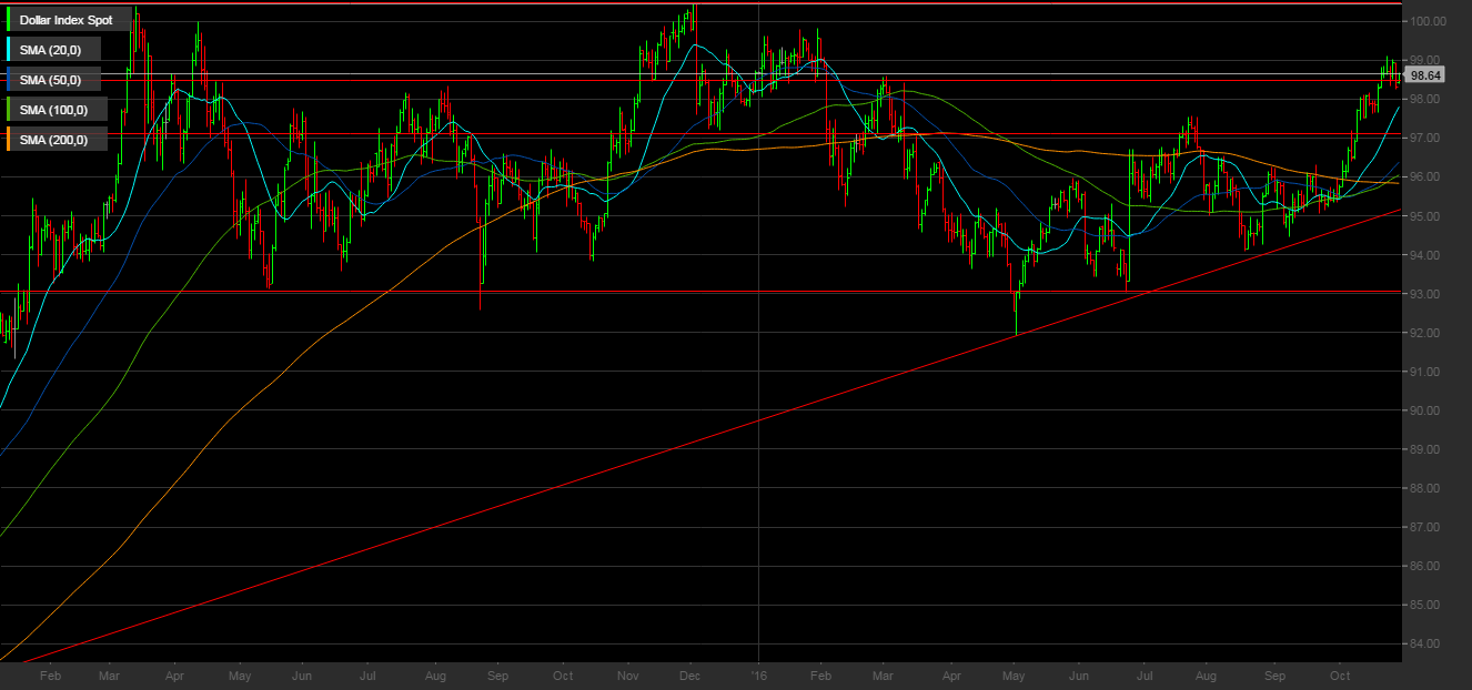 Il Dollaro nella seduta di martedì aveva toccato i massimi degli ultimi 8 mesi in area 99 per poi ritracciare a causa della nuova incertezza piombata sulle elezioni USA dopo lo scandalo mailgate che ha colpito la candidata democratica. Un anno stellare quello del dollaro che lo ha visto guadagnare costantemente terreno nei confronti delle principali major mondiali.