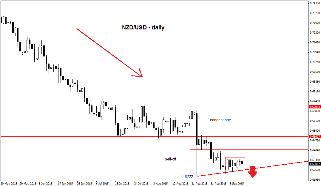 L’attuale fase di congestione in corso fa presupporre un imminente movimento direzionale esplosivo, che quasi certamente sarà al ribasso con l’eventuale perdita di area 0,6220. In questo caso il Kiwi dovrebbe scendere sui livelli più bassi da oltre 6 anni, con l’obiettivo di puntare ai bottom di inizio 2009 quando la quotazione scese fin sotto 0,49 prima di ripartire con decisione al rialzo. Il cambio potrebbe crollare già questa settimana, considerando che domani inizia il meeting del FOMC che porterà all’annuncio ufficiale del nuovo tasso di interesse negli Usa nella serata di giovedì.