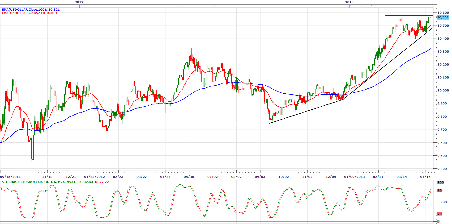 Siamo partiti con movimenti abbastanza calmi dopo la settimana che ha visto l’euro salire fino a 1.3200 per poi scendere nuovamente a 1.3000, la sterlina muoversi tra 1.5200 e 1.5400 a fasi alterne ed il dollaro australiano sotto pressione vicino a quella pericolosa soglia rappresentata da 1.0150. Tutti, contro il dollaro americano, che sta mostrando i propri massimi, se diamo uno sguardo al DJ FXCM Dollar Index, che si è riportato sui livelli di massimo assoluto fatti segnare all’inizio di marzo. Se a questo aggiungiamo il UsdJpy, che è tornato a sfiorare l’importante quota di 100 yen per ogni biglietto verde, capiamo come il green back sia stato acquistato contro tutto, rimanendo in sostanziale posizione di forza anche contro le materie prime, che dopo le forti discese mostrate stanno tentando dei recuperi che, se paragonati alla forza con cui si sono manifestati i movimenti che hanno portato l’oro a scendere sotto 1,350.00 ed il petrolio a superare, chiaramente a ribasso, 90.00, sembrano possano rivelarsi di consolidamento.