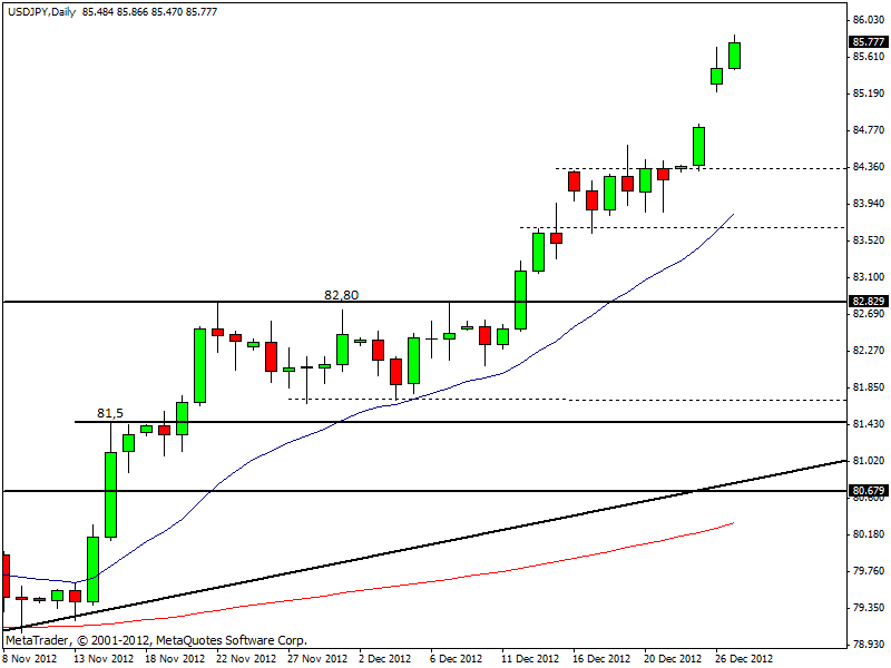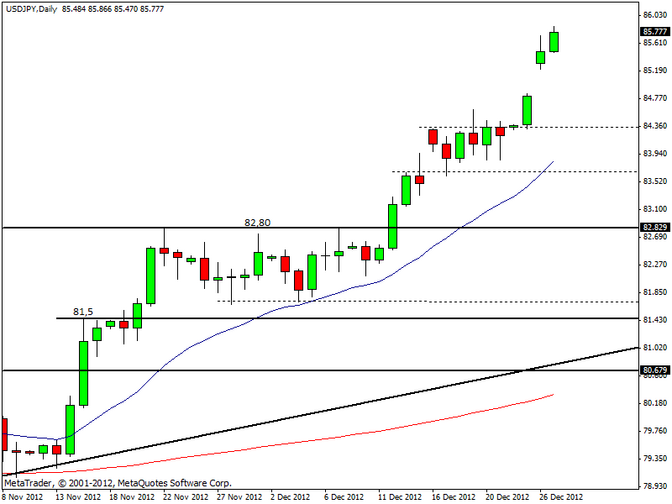 Sul forex non accenna a fermarsi la corsa al ribasso dello yen. La svalutazione della moneta giapponese è in corso ormai da metà settembre scorso, ma da allora non ci sono state molte soste lungo questo spettacolare trend direzionale. Il tasso di cambio dollaro/yen è volato sui massimi da ottobre 2010 a 85,86, dopo che ieri il cambio aveva aperto con un ampio gap a seguito dell’insediamento del nuovo governo targato Shinzo Abe.