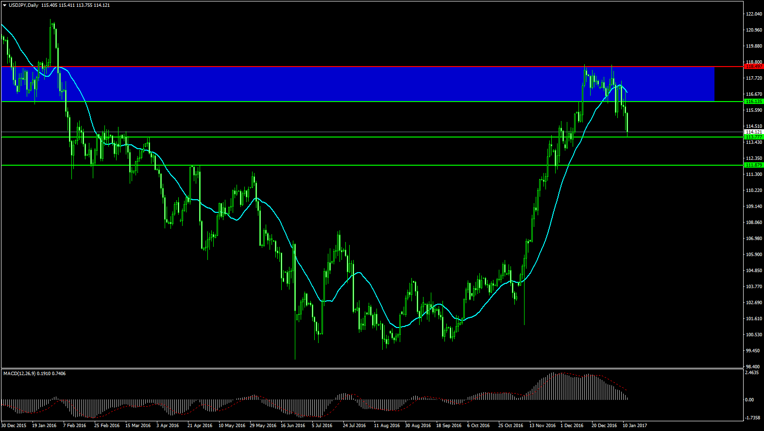 Come osservabile dal seguente grafico giornaliero, dollaro-yen ha lasciato la zona di massimi in blu (che corrisponde alla zona di minimi per il 2015) senza superarla e tornando in direzione del test a quota 113,7: