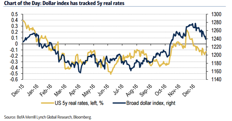 In superficie, la fine del rally generato da Trump appare solo parziale.Nonostante il rialzo del dollaro abbia rallentato ad inizio 2017, i trade che sfruttano la reflazione, tra cui alcuni titoli azionari e materie prime, hanno performato relativamente bene. La risposta, come più volte la Bank of America Merrill ha sostenuto, si trova nei relativi movimenti dei breakeven dell’inflazione negli Stati Uniti e dei tassi reali: questi sono aumentati in tandem dopo la vittoria di Trump alle elezioni USA 2016, ma da allora sono divergenti. Come accade generalmente, le azioni hanno monitorato i breakeven, mentre il dollaro ha seguito i tassi reali.