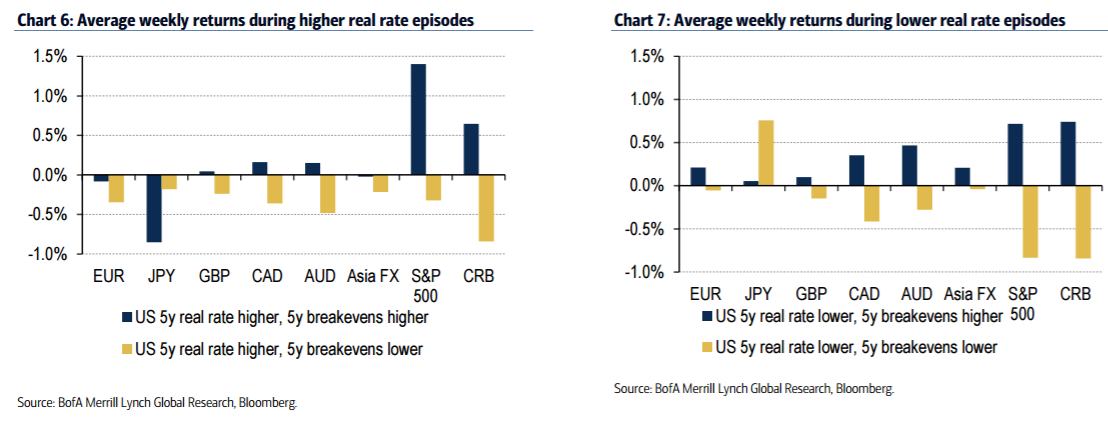 Se i tassi reali statunitensi aumentano, l’acquisto sul cambio USD/JPY presenta la migliore opportunità rischio-rendimento se siamo indifferenti sul fronte del breakeven. Il grafico 6 mostra che lo yen tipicamente si deprezza indipendentemente dalla direzione del breakeven (come fa l’euro) e il grafico 5 mostra che è, più in generale, strettamente correlato con il differenziale dei tassi reali a 5 anni.