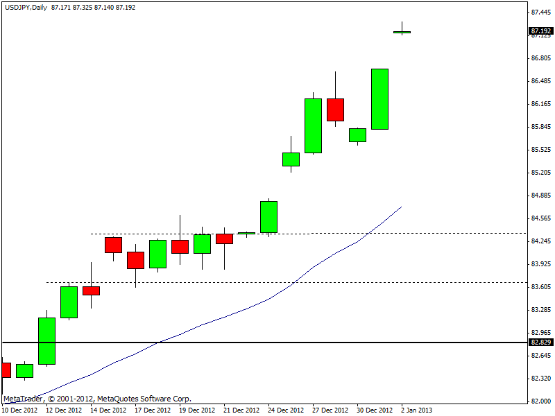 Il tasso di cambio dollaro/yen, che ha chiuso il 2012 con una performance superiore al 12%, ha aperto il nuovo anno con un forte gap up a 87,17. I prezzi sono riusciti a spingersi fino a 87,32, toccando così il massimo più alto da agosto 2010. A dare slancio al cambio in questo inizio 2013 è stato anche l’accordo sul fiscal cliff, raggiunto in extremis negli Stati Uniti.