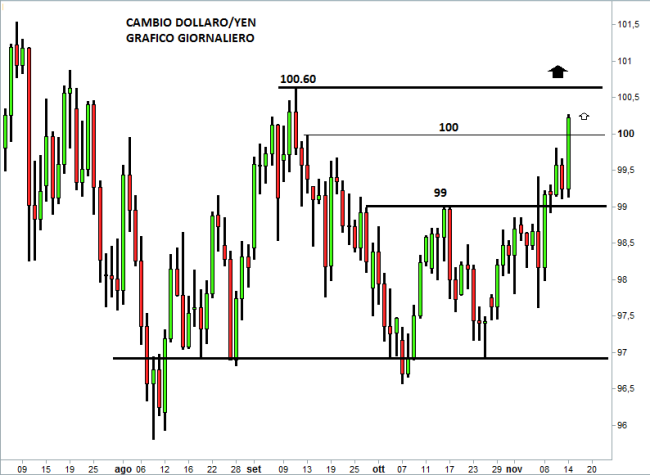 Stamattina ha chiuso in forte rialzo anche l’indice azionario Nikkei-225, che è salito dell’1,95% a 15.165,92 punti sui massimi da quasi 6 mesi. Il superamento della soglia psicologica di 15mila punti potrebbe aprire le porte a nuovi allunghi almeno fino a 16mila punti. La forza della borsa di Tokyo, ma più in generale dell’azionario, sta provocando un netto calo della domanda di yen. Il cambio dollaro/yen potrebbe ora spingersi a 100,60 prima e 101 poi nel breve periodo. Il target da qui a fine anno è posto a 103,70, ovvero sull’area di massimo toccata nel maggio scorso.