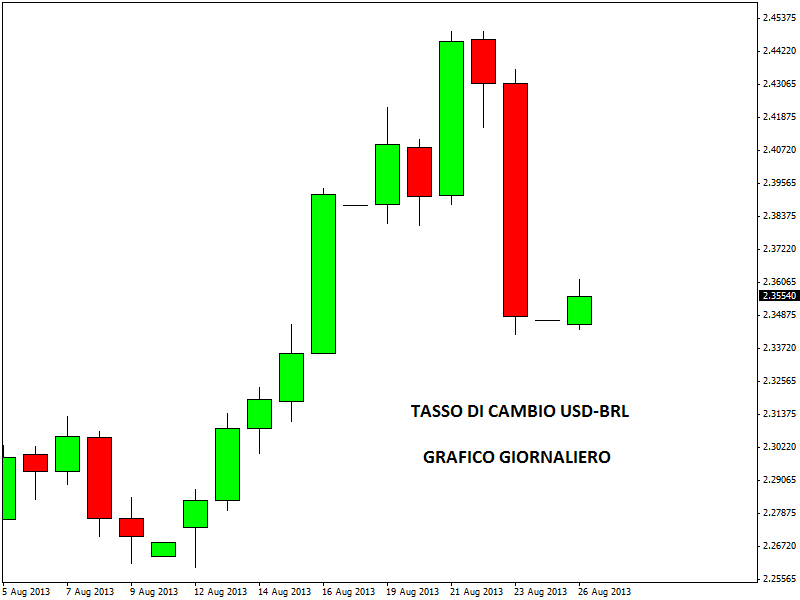 Il real brasiliano è una delle valute più colpite, tra quelle dei mercati emergenti, dalle aspettative di lancio del tapering della FED. Il Brasile ha così annunciato un nuovo intervento a sostegno della propria valuta, per impedire un crollo senza freni in grado di auto-alimentare il già consistente deflusso di capitali esteri. Dopo il taglio delle stime di crescita per l’anno in corso al 2,5% dal 3%, le autorità monetarie brasiliane hanno annunciato un piano di acquisto titoli, con immissione di 60 miliardi di dollari nel sistema valutario da qui a fine anno.