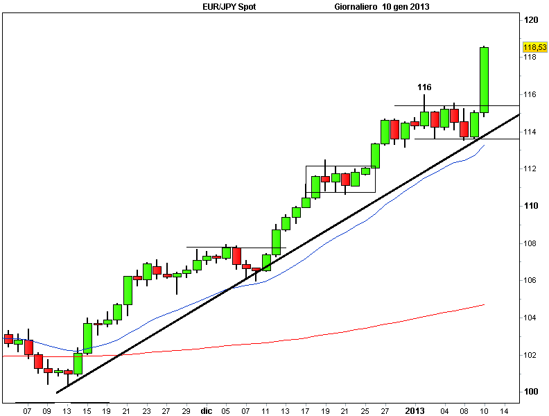 Abe ha approvato un piano di stimoli monetari da 10.300 miliardi di yen e ha promesso un legame più stretto con la BoJ per combattere duramente la deflazione. Sul forex il tasso di cambio euro/yen è salito fino a 118,58, toccando i massimi più alti da maggio 2011. Su base weekly il cambio sembra proiettato verso area 123, anche se il target più a portata di mano nel breve termine è senza dubbio quota 120.
