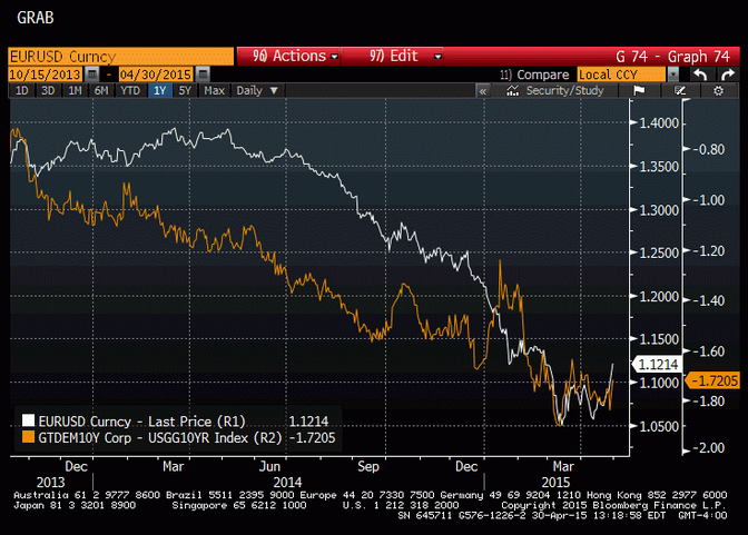 I rendimenti dei Treasuries USA sono aumentati giovedì, ma quelli dei bund tedeschi sono aumentati ancora di più. Il grafico seguente mostra come l’euro-dollaro EUR/USD sia spinto dallo spread dei bond a 10 anni di Germania e Stati Uniti, che ha iniziato a salire proprio quando l’euro-dollaro ha rotto quota 1.09.