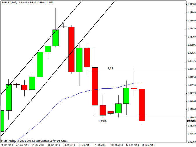 Continua il calo dell’euro sui mercati valutari, complice i dati negativi sul pil 2012 e il peggioramento delle stime da parte della Bce nel suo consueto bollettino mensile. Sul forex il tasso di cambio euro/dollaro, che ieri era salito temporaneamente sopra 1,35, è crollato fin sotto 1,3350 toccando il minimo più basso delle ultime tre settimane. I prezzi sono scesi per ora fino a 1,3334. Giù anche il cambio euro/yen, che ha perso anche quota 125 spingendosi fino a 124,74 sui minimi a tre giorni. Da un punto di vista tecnico, se il cambio euro/dollaro dovesse chiudere sotto 1,3350, c’è una forte probabilità che prezzi possano arretrare ancora entro domani fino a 1,33 prima e 1,3250 poi. Il quadro tecnico è peggiorato molto, per cui la flessione dei prezzi dovrebbe ancora proseguire.