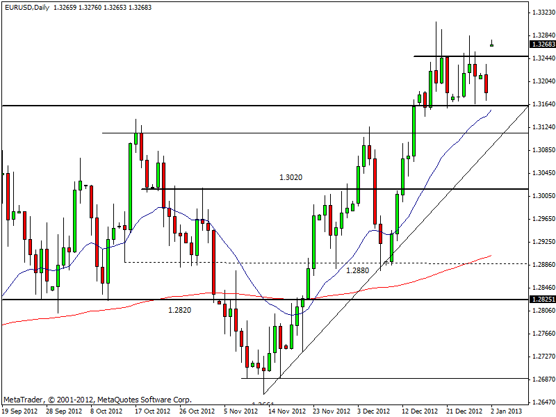 La quotazione di apertura di euro/dollaro nel 2013 è di 1,3266. Nell’ultima seduta del 2012 aveva chiuso a 1,3185, per cui c’è stato un gap di 81 pip: una vera rarità nel forex. A decretare questo gap è stato probabilmente l’accordo sul fiscal cliff negli Stati Uniti, raggiunto in extremis, che oggi dovrebbe essere firmato da Obama.