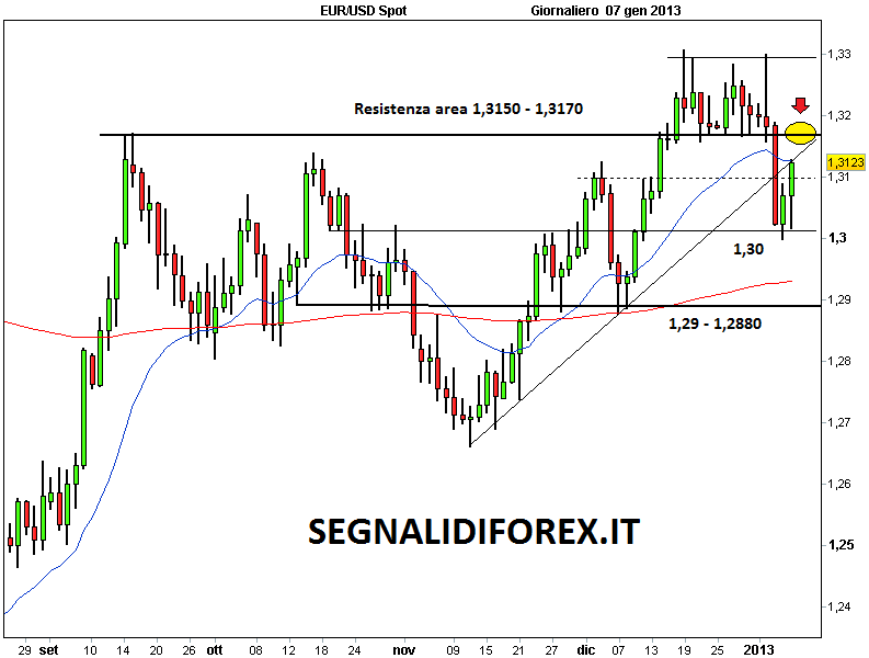 Il tasso di cambio euro/dollaro ha evidenziato un interessante rimbalzo tecnico negli ultimi due giorni, dopo le forti vendite di inizio anno. I prezzi sono riusciti a evitare la perdita del supportone di area 1,30 e da questi livelli si è potuto assistere a un movimento bullish in linea con il trend principale, che ha riportato la quotazione fin sopra 1,31. Il cambio è salito stanotte fino in area 1,3140, dove però ha incontrato una forte opposizione dei venditori.