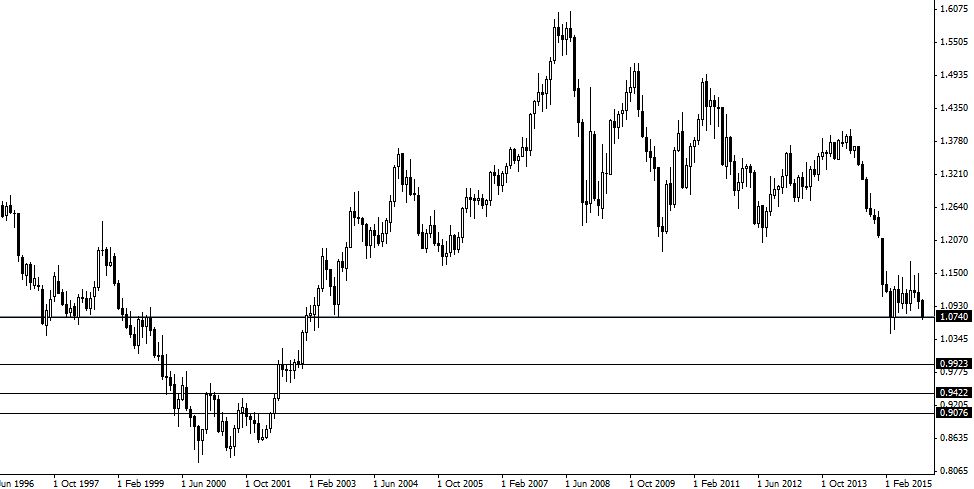 Il cambio euro-dollaro si è appena attestato a ridosso del supporto di 1.0740 che nel lungo termine ha una valenza molto importante: nel grafico con timeframe mensile questo è il prezzo in cui si è arrestata la candela dello scorso marzo, al termine della grande discesa della major da 1.3993.