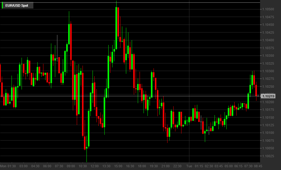 Il cambio euro-dollaro (EURUSD) è in moderato rialzo nel momento in cui si scrive (+0,04%) a 1,1023.