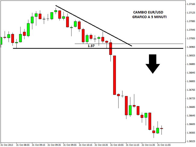 Giornata molto negativa per la moneta unica, che sul forex sperimenta massicce vendite a seguito della pubblicazione del dato sull’inflazione nell’area euro. A ottobre l’indice dei prezzi al consumo nell’eurozona si è attestato a +0,7% su base annua, ovvero su livelli decisamente distanti dal target della BCE fissato al 2%. Inoltre il tasso di inflazione è sceso sui livelli più bassi degli ultimi 4 anni. A questo punto si pensa che le pressioni deflazionistiche possano spingere l’Eurotower a valutare nuove strategie di politica monetaria orientate all’aumento dell’offerta di moneta.