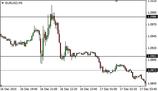 Nello scorso 16 dicembre 2015, data in cui la FED ha aumentato il tasso d’interesse allo 0,50%, il cambio euro-dollaro ha subìto una forte volatilità prima di prendere la strada al ribasso. Ecco quanto accaduto nel grafico con timeframe a 5 minuti: