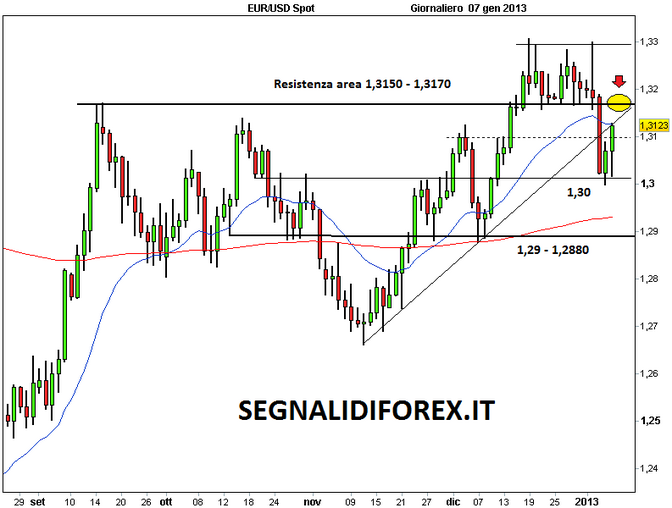 Il tasso di cambio euro/dollaro resta inchiodato poco sopra 1,31, senza riuscire a effettuare lo strappo decisivo. Attualmente il cambio quota in area 1,3120 e solo in caso di breakout esplosivo di 1,3140 potrebbe ambire a rally fino a 1,3170 - 1,3180 nelle prossime ore. Finora non sono bastati alcuni driver pro-euro per spingere la moneta unica in forte rialzo.