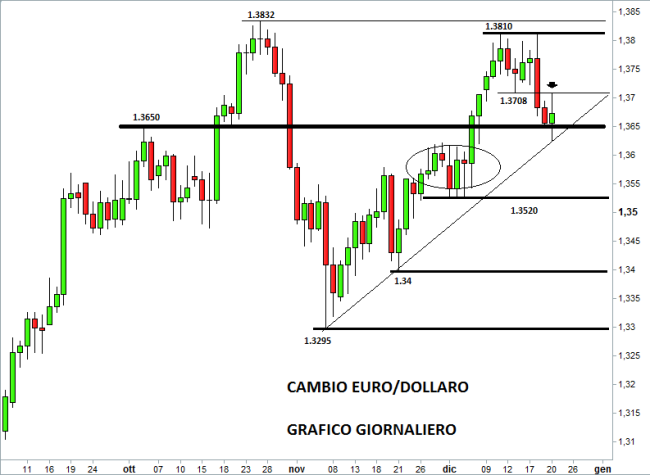 Respinto in area 1,3810, il cambio euro/dollaro ha invertito la rotta e sceso fino a toccare l’area di supporto di 1,3620, dove passa anche la trendline rialzista di breve-medio periodo che parte dai bottom dello scorso 7 novembre, ovvero 1,3295. Il quadro tecnico si è deteriorato molto negli ultimi giorni e i prezzi sembrano quasi incapaci di risalire la china oltre il livello di 1,37.