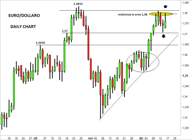 Il cambio euro/dollaro resta poco sotto la fondamentale barriera grafica di 1,38, che finora ha resistito molto bene ai continui assalti dei compratori. Nel mirino resta sempre il precedente massimo annuale di 1,3832, toccato lo scorso 25 ottobre. In caso di breakout rialzista esplosivo, i prezzi potrebbero accelerare bruscamente al rialzo e spingersi fino a 1,40 entro fine anno. Di converso, la tenuta dell’area di resistenza compresa tra 1,38 e 1,3830 dovrebbe creare i presupposti per una maggiore pressione ribassista con possibile correzione dei prezzi verso 1,37 – 1,3650.