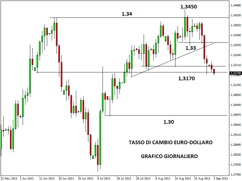 Continua la fase discendente di breve periodo per le quotazioni del tasso di cambio euro-dollaro, che stamattina hanno sperimentato una nuova decisa pressione ribassista sull’area di supporto di 1,3170. I prezzi hanno toccato quota 1,3168, il minimo più basso da oltre un mese. A questo punto, se avverrà il breakout ribassista definitivo di 1,3170, è molto probabile un approfondimento bearish verso 1,3070 prima e 1,30 poi.
