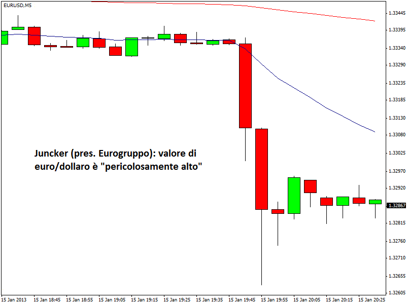 Giornata di vendite anche quella odierna sul tasso di cambio euro/dollaro, che ieri aveva sperimentato un brusco sell-off poco prima delle ore 20 a seguito delle dichiarazioni rilasciate da Jean-Claude Juncker, presidente dell’Eurogruppo, secondo il quale la quotazione attuale del cambio euro/dollaro risulta "pericolosamente alta". Dopo le parole di Juncker, il cambio euro/dollaro è riuscito a scendere fin sotto 1,3270 da 1,3330 nel giro di dieci minuti circa.