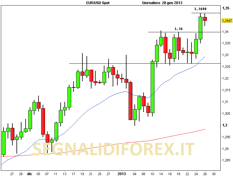 In caso di breakout esplosivo di 1,3480, i prezzi potrebbero salire fin sopra 1,35 spingendosi verso i target posti a 1,3550 prima e 1,3580 poi. Nelle prossime ore non va escluso, però, un pullback verso 1,34, dove però i compratori potrebbero tornare a comprare euro con decisione prima ancora dell’eventuale breakout dei top di periodo. Un segnale di debolezza sarà fornito solo dalla chiusura daily sotto 1,34.