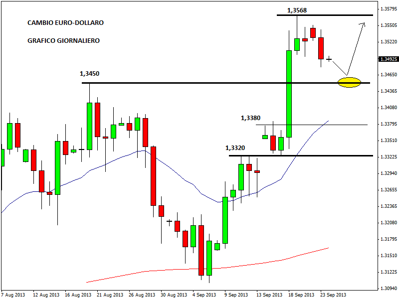 Stamattina sarà pubblicato l’indice IFO tedesco, ore 10. Gli analisti finanziari si aspettano un miglioramento a 108,4 punti dai 107,5 punti del mese precedente. Ieri, però, ha deluso le aspettative l’indice PMI tedesco, risultato in calo anche se sopra la fatidica soglia di 50 punti. Sul forex il tasso di cambio euro-dollaro è tornato sotto 1,35, dopo che giovedì scorso era salito sui massimi più alti degli ultimi 8 mesi a 1,3568. Secondo gli esperti il cambio tornerà a scalfire i massimi dell’anno di 1,3710. Nel breve periodo, però, potrebbe esserci un pullback fino a 1,3450 o anche fino a 1,34.