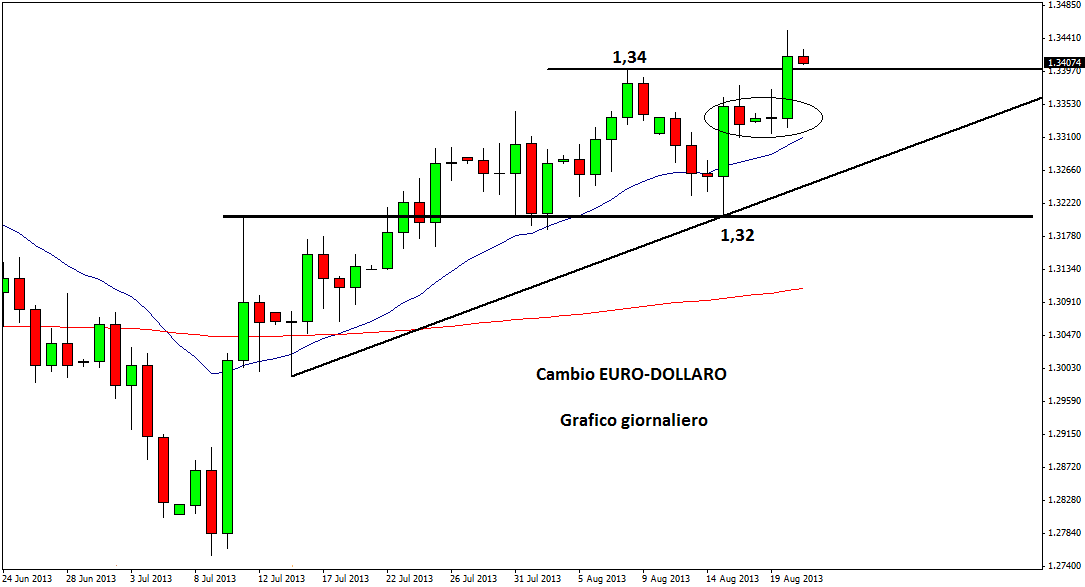 Continua a salire con decisione il tasso di cambio euro-dollaro, che ieri ha superato anche la resistenza di 1,34 spingendosi fino a 1,3451 sui massimi più alti degli ultimi 6 mesi. Nonostante il forte aumento degli spread sovrani europei, avvenuto nelle ultime due sedute, la moneta unica resta ben impostata in attesa della lettura dei verbali dell’ultimo meeting della FED in programma questa sera. Il tema caldo sui mercati mondiali resta la possibilità che l’istituto monetario di Washington lanci il "tapering", ovvero il processo di riduzione degli stimoli monetari.