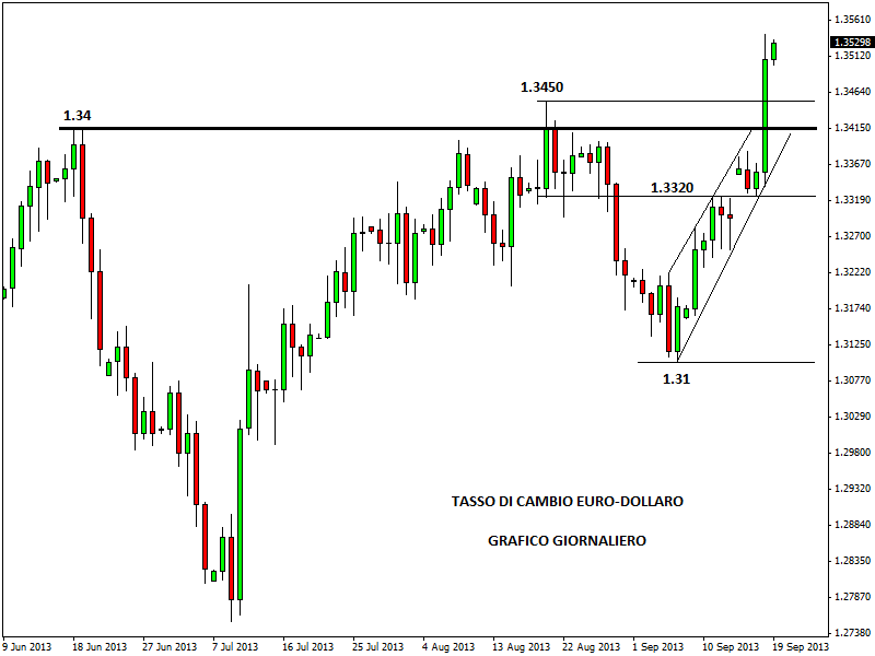 La decisione della FED di rinviare il tapering ha decretato un vero e proprio crollo generalizzato del dollaro americano, che ha registrato pesanti perdite nei confronti delle major currencies. Il biglietto verde sembra ora destinato a nuovi deprezzamenti nelle prossime settimane. In particolare il tasso di cambio euro-dollaro è volato fino a 1,3542, sui livelli più alti degli ultimi 7 mesi. Durante la sessione asiatica il cambio ha messo a punto una fase di consolidamento, per cui già stamattina potrebbe sperimentare nuovi allunghi al rialzo in caso di breakout deciso della resistenza di area 1,3540 - 1,3550.