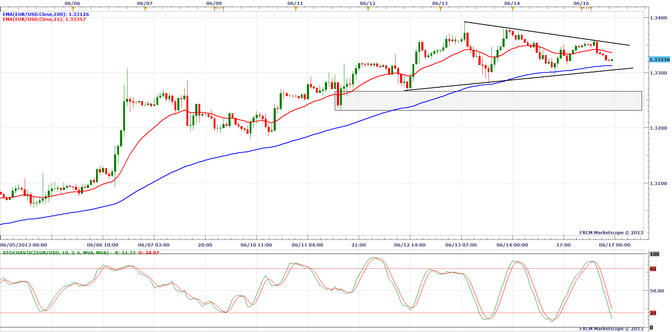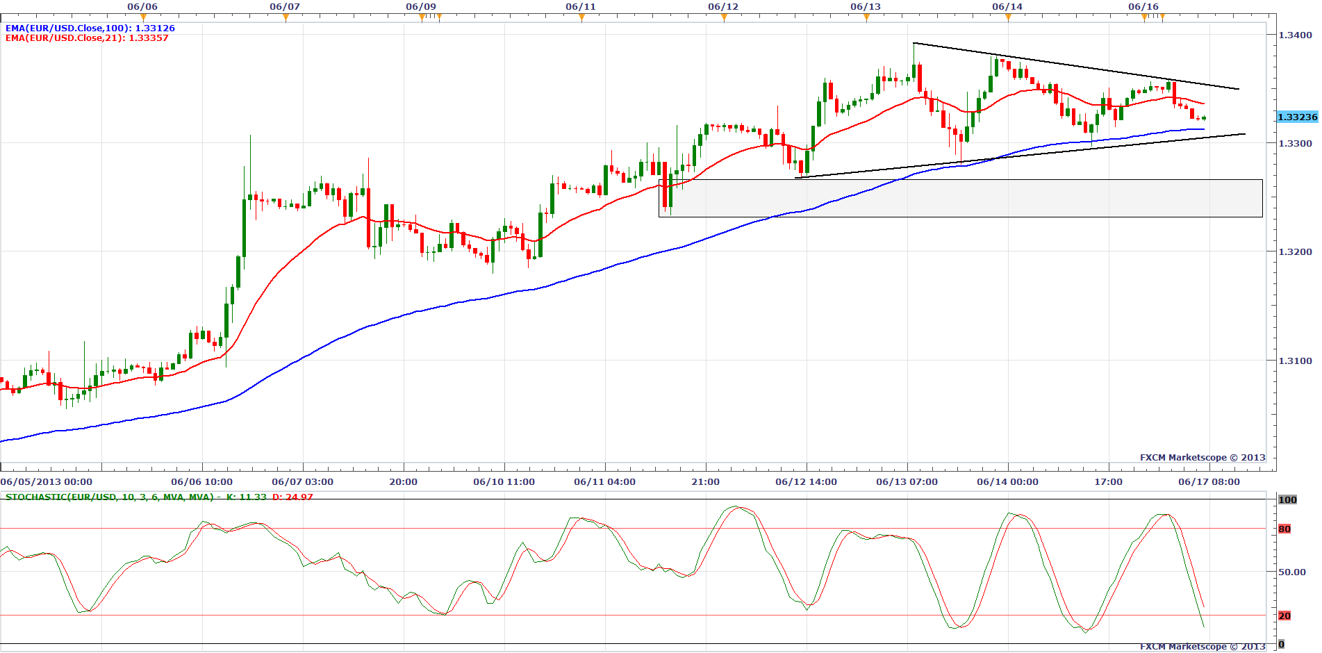 L’euro sta consolidando all’interno di una figura di restrizione di volatilità che restituisce dei livelli dinamici da poter seguire a livello di analisi ma che, operativamente parlando risultano essere difficilmente sfruttabili per dei breakout a causa della vicinanza dei livelli di minimi e di massimi precedenti. Vi sono però degli spunti di riflessione interessanti sui quali ragionare. Le medie orarie risultano essere impostate a rialzo ed i prezzi continuano a muoversi sopra di esse (la 100, in ultima istanza, sta facendo da supporto dinamico). Se ci si sposta su un grafico a 4 ore poi, si nota come ci si trovi sopra la media a 21 (che ha accompagnato le quotazioni fino a qui) e come il triangolo di potenziale continuazione sia più evidente. Attenzione dunque a potenziali salite oltre i massimi, che se dovessero superare area 1.3430 potrebbero far accelerare i prezzi. L’area di supporto principale da seguire passa sotto le medie orarie e comunque, fino a quando ci troviamo sopra 1.3230 non andremo a considerare scenari ribassisti su cui lavorare.