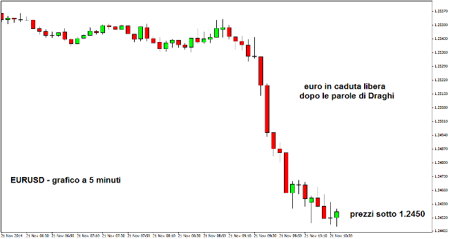 Draghi è uscito definitivamente allo scoperto e ha fatto intendere di essere pronto ad annunciare il QE a stretto giro di boa. Va giù pesante l’euro/dollaro, fin sotto 1,2450